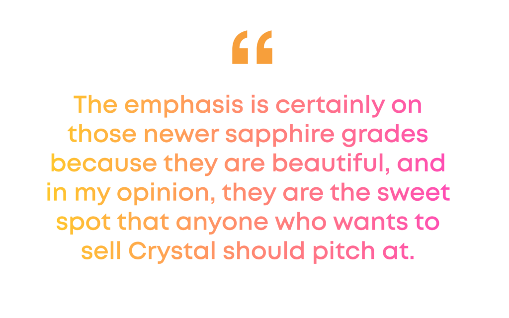 The emphasis is certainly on those newer sapphire grades because they are beautiful, and in my opinion they are the sweet spot that anyone who wants to sell Crystal should pitch at.