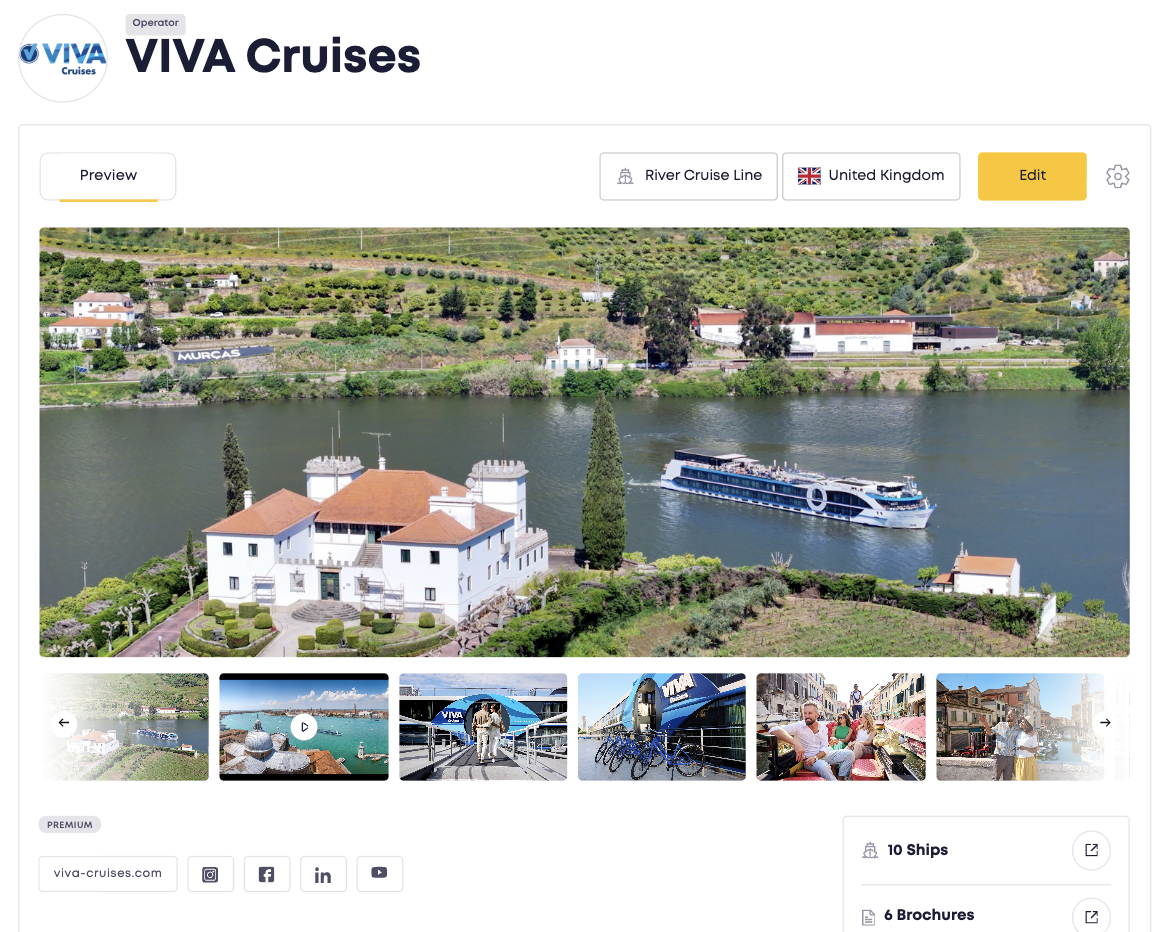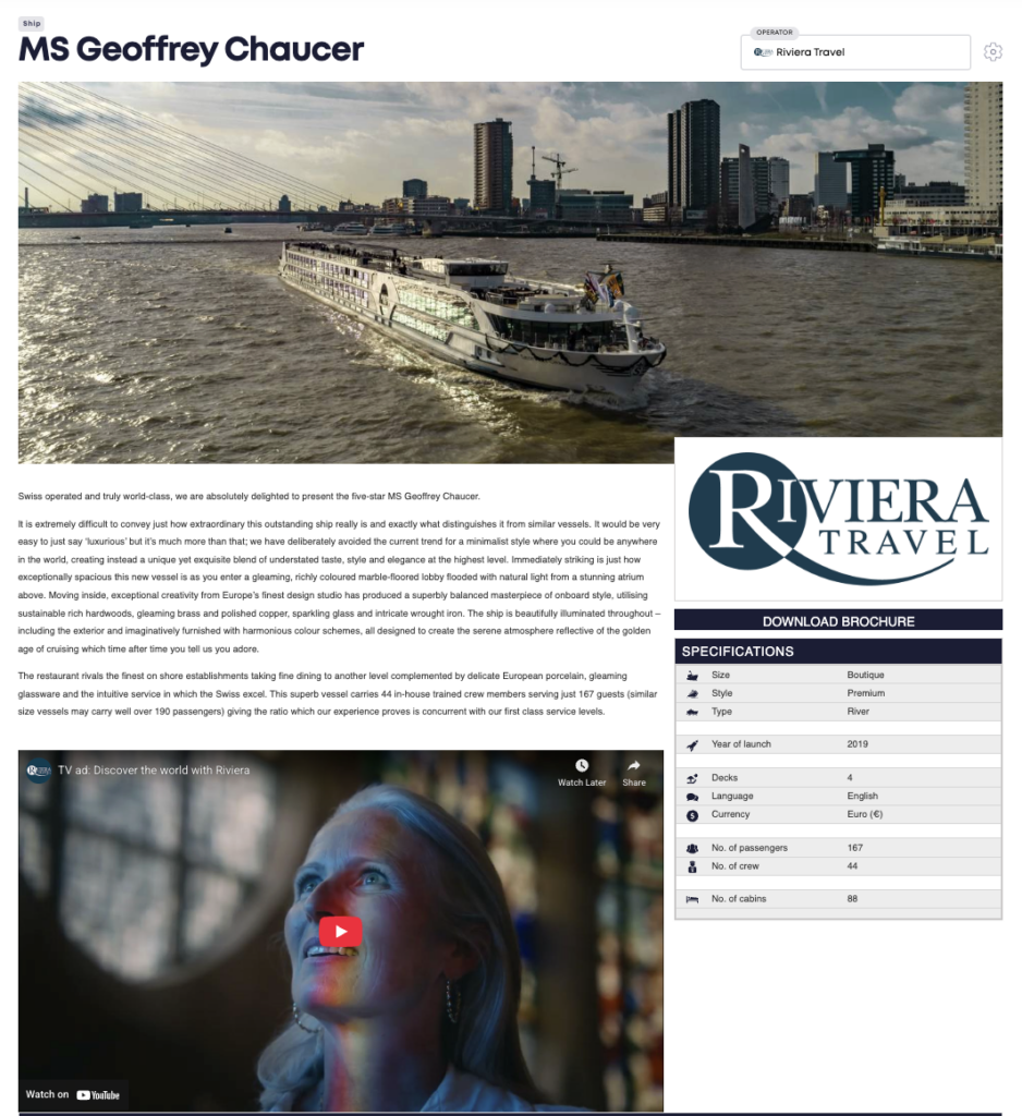 Cruise lines and tour operators can log in to their own dashboard to manage their brand, view their content from an agent’s perspective, and monitor which travel agents are accessing their content via Widgety’s API or Widget solution.
